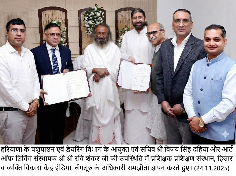 चण्डीगढ़, 24 नवम्बर – हरियाणा के पशुपालन एवं डेयरिंग विभाग के प्रशिक्षक प्रशिक्षण संस्थान (टीटीआई), हिसार व आर्ट ऑफ़ लिविंग, बेंगलूरु (व्यक्ति विकास केंद्र इंडिया) के बीच एक महत्वपूर्ण एमओयू पर हस्ताक्षर किए गए । यह कार्यक्रम हरियाणा सरकार के पशुपालन एवं डेयरिंग विभाग के आयुक्त एवं सचिव विजय सिंह दहिया, आईएएस और आर्ट ऑफ़ लिविंग संस्थापक श्री श्री रवि शंकर जी की उपस्थिति में चंडीगढ़ में संपन्न हुआ।