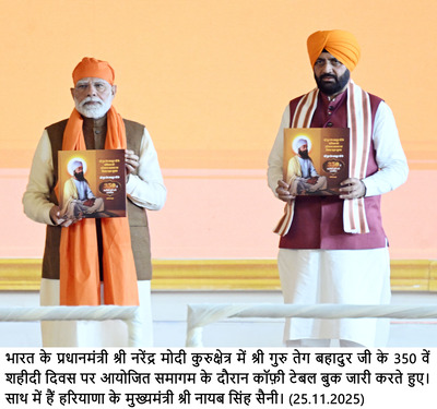 कुरुक्षेत्र, वैद्य पण्डित प्रमोद कौशिक : प्रधानमंत्री नरेंद्र मोदी ने आज मंगलवार को हरियाणा के धर्मनगरी कुरुक्षेत्र में श्री गुरु तेग बहादुर जी के 350वें शहीदी दिवस पर आयोजित कार्यक्रम को संबोधित किया। उन्होंने कहा कि उनका अटूट साहस और सेवा भावना सभी को प्रेरित करती है।