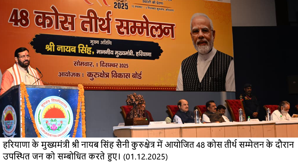 चंडीगढ़, 1 दिसंबर — हरियाणा के मुख्यमंत्री श्री नायब सिंह सैनी ने कहा कि प्रदेश सरकार कुरुक्षेत्र को दुनिया का सबसे गौरवपूर्ण स्थान बनाने के लिए प्रतिबद्ध है। प्रधानमंत्री श्री नरेंद्र मोदी के मार्गदर्शन के बाद वर्ष 2016 से कुरुक्षेत्र में गीता महोत्सव को अन्तर्राष्ट्रीय स्तर पर मनाया जा रहा है।