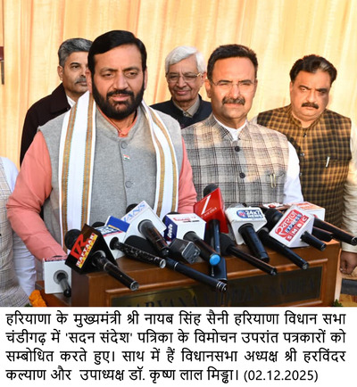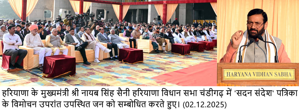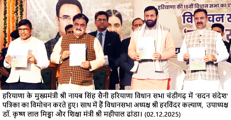 चंडीगढ़, 2 दिसंबर– हरियाणा के मुख्यमंत्री श्री नायब सिंह सैनी ने मंगलवार को हरियाणा विधानसभा द्वारा प्रकाशित पत्रिका ‘सदन संदेश’का विमोचन किया। मुख्यमंत्री ने इसे विधानसभा द्वारा जनसंचार की दिशा में एक महत्वपूर्ण पहल बताते हुए कहा कि यह केवल पत्रिका का विमोचन नहीं, बल्कि नई सोच, नई दिशा और नए संकल्प का शुभारंभ है।