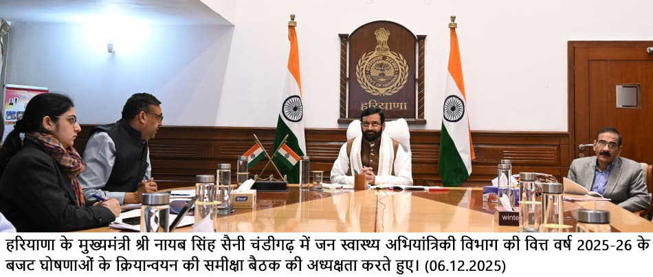 चंडीगढ़, 6 दिसंबर — हरियाणा के मुख्यमंत्री श्री नायब सिंह सैनी ने शनिवार को जनस्वास्थ्य एवं अभियांत्रिकी विभाग की महत्वपूर्ण बजट घोषणाओं की उच्चस्तरीय समीक्षा बैठक की अध्यक्षता करते हुए स्पष्ट निर्देश दिए कि विभाग लंबित परियोजनाओं को तय समय सीमा में पूरा करे। उन्होंने कहा कि सरकार की प्राथमिकता जनता को बुनियादी सुविधाओं का लाभ तुरंत और प्रभावी रूप से उपलब्ध करवाना है, इसलिए प्रत्येक अधिकारी जिम्मेदारी और तत्परता के साथ कार्य करें।