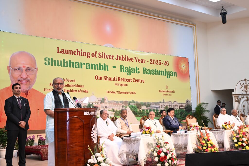 गुरूग्राम, 07 दिसंबर। भारत के उप राष्ट्रपति एवं राज्यसभा के सभापति श्री सी. पी. राधाकृष्णन ने कहा कि भारत के ऋषियों, मुनियों और तपस्वियों की साधना ने विश्व को ध्यान, आत्मबल और सत्य के मार्ग पर अग्रसर किया है। राजयोग, विपस्सना और तपस्या जैसी समृद्ध आध्यात्मिक परंपराएं आज भारत को विश्व गुरु बना रही है। उन्होंने कहा कि प्रधानमंत्री श्री नरेंद्र मोदी के विकसित भारत 2047 के संकल्प में भी यही आध्यात्मिक शक्ति राष्ट्र का मार्गदर्शन कर रही है। उप राष्ट्रपति रविवार को गुरुग्राम जिला के बहोड़ा कलां में स्थित ब्रह्माकुमारी ईश्वरीय विश्वविद्यालय के ओम शांति रिट्रीट सेंटर के रजत जयंती वर्ष के शुभारंभ अवसर पर “शुभारंभ – रश्मियां” कार्यक्रम को बतौर मुख्यातिथि संबोधित कर रहे थे। उप राष्ट्रपति ने इस अवसर पर ओम शांति संस्थान के रजत रश्मियां के नाम से मनाए जाने वाले रजत जयंती वर्ष का शुभारंभ किया। उप राष्ट्रपति के हरियाणा आगमन पर उद्योग एवं वाणिज्य मंत्री राव नरबीर सिंह ने उनका स्वागत किया।
