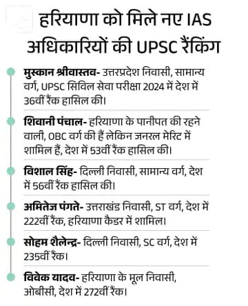 खास बात यह है कि इनमें से दो कैंडिडेट हरियाणा के रहने वाले हैं, जबकि बाकी चार उम्मीदवार दूसरे राज्यों से हैं। वहीं हरियाणा की हर्षिता गोयल ने UPSC 2024 की परीक्षा में ऑल इंडिया रैंक 2 हासिल की, लेकिन उन्हें हरियाणा कैडर नहीं मिला।