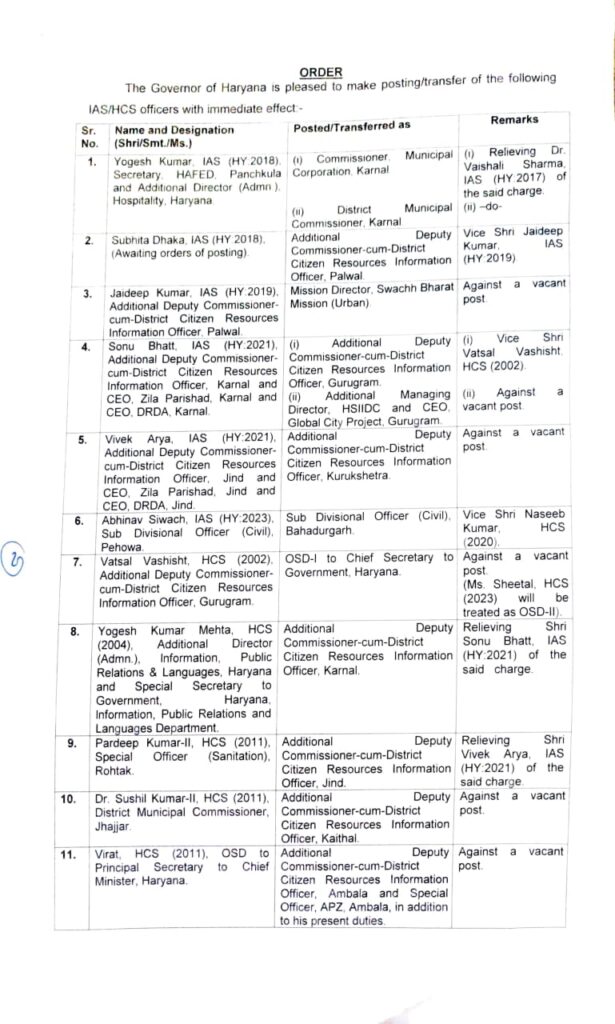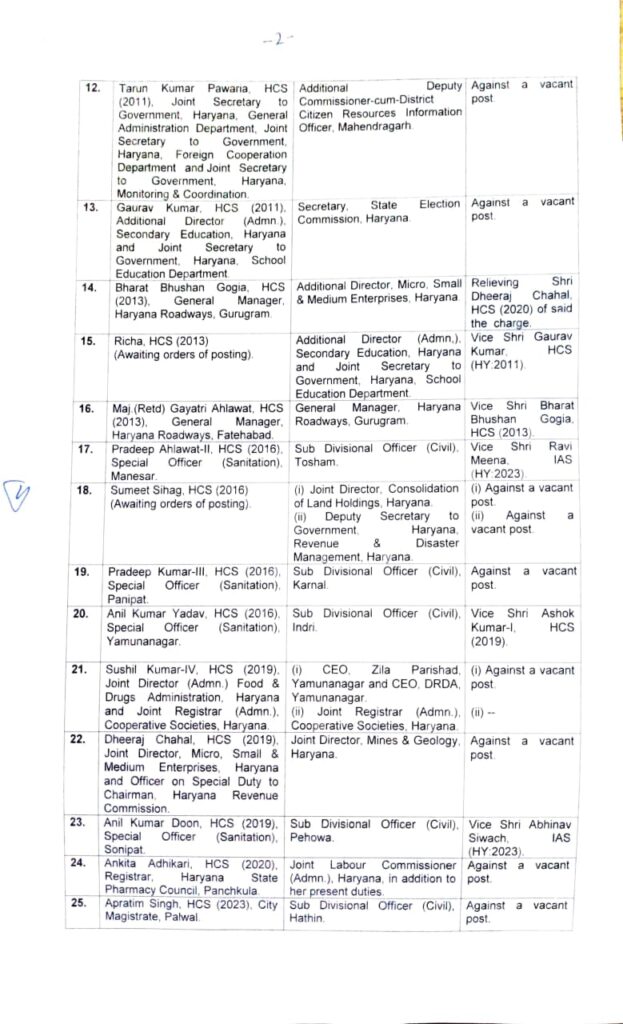कई अधिकारियों को SDO (सिविल) के रूप में पिहोवा, तोशाम, करनाल, इंद्री, हथीन सहित विभिन्न उप-मंडलों में तैनात किया गया है।