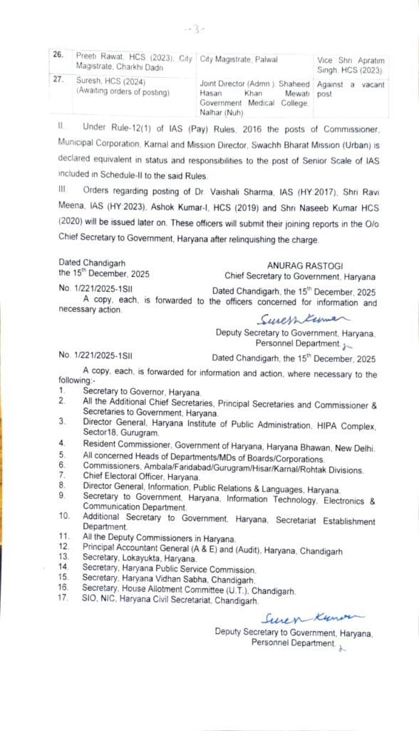 चंडीगढ़, 15 दिसंबर 2025। हरियाणा सरकार ने प्रशासनिक स्तर पर बड़ा फेरबदल करते हुए 27 IAS और HCS अधिकारियों के तबादले व नई तैनातियां की हैं। राज्य के मुख्य सचिव अनुराग रस्तोगी द्वारा जारी आदेशों के अनुसार यह सभी नियुक्तियां तत्काल प्रभाव से लागू होंगी। इस फेरबदल में नगर निगम, जिला प्रशासन, स्वच्छ भारत मिशन, शिक्षा विभाग, राज्य चुनाव आयोग, हरियाणा रोडवेज सहित कई महत्वपूर्ण विभाग शामिल हैं।