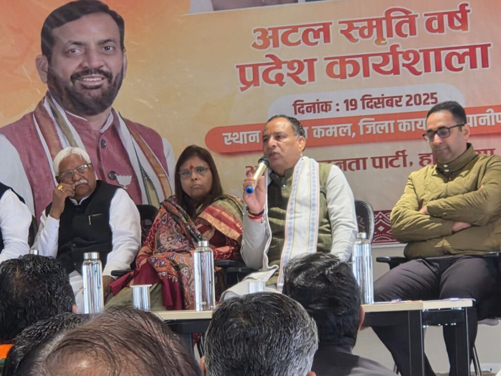 चंडीगढ़, 19 दिसंबर। भारतीय जनता पार्टी पूर्व प्रधानमंत्री एवं भारत रत्न अटल बिहारी वाजपेयी की जन्म शताब्दी वर्ष को अटल स्मृति दिवस के रूप में मना रही है। शुक्रवार को कार्यक्रमों के सफल आयोजन को लेकर पानीपत स्थित भाजपा कार्यालय श्याम कमल में भाजपा प्रदेश अध्यक्ष पंडित मोहन लाल बड़ौली की अध्यक्षता में कार्यशाला आयोजित की गई जिसमें नेताओं को आवश्यक जिम्मेदारियां सौंपी गई। भाजपा प्रदेश अध्यक्ष बड़ौली ने अटल स्मृति सम्मेलन के जिला संयोजकों और सह संयोजकों कार्य योजना समझाई। प्रदेश व जिला स्तर पर होने वाले कार्यक्रमों बारे में बैठक में विस्तार से चर्चा हुई और कार्यकर्ताओं को जरूरी दिशा निर्देश दिए गए।