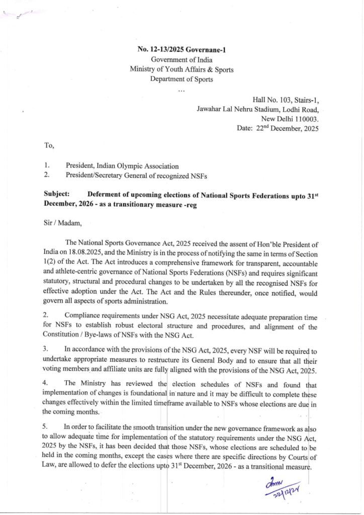 भारत सरकार के नये नेशनल खेल प्रशासन एक्ट 2025 को 18 अगस्त 2025 को माननीय राष्ट्रपति की स्वीकृति प्राप्त हो चुकी है। अधिनियम के अंतर्गत राष्ट्रीय खेल संघों को अपने संविधान/उपनियमों, निर्वाचन प्रक्रिया तथा प्रशासनिक ढांचे में आवश्यक संशोधन एवं समन्वय किया जाना अपेक्षित है, जिसके लिए पर्याप्त समय आवश्यक है।