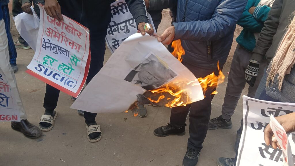वेनेजुएला पर सैन्य हमले के विरोध में गुड़गांव में डोनाल्ड ट्रंप का पुतला दहन