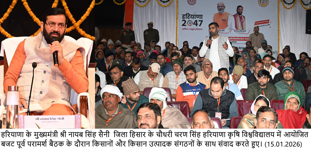 चंडीगढ़, 15 जनवरी – हरियाणा के समग्र कृषि विकास, किसानों की आय बढ़ाने तथा कृषि एवं संबद्ध क्षेत्रों को और अधिक सशक्त बनाने के उद्देश्य से वीरवार को चौधरी चरण सिंह हरियाणा कृषि विश्वविद्यालय हिसार में कृषि एवं संबद्ध क्षेत्रों पर बजट-पूर्व परामर्श बैठक का आयोजन किया गया। बैठक की अध्यक्षता मुख्यमंत्री श्री नायब सिंह सैनी ने की। बैठक में मुख्यमंत्री ने कृषि विशेषज्ञों, प्रगतिशील किसानों, किसान उत्पादक संगठनों (एफपीओ), पशुपालन, बागवानी, मत्स्य पालन एवं ग्रामीण अर्थव्यवस्था से जुड़े हितधारकों से आगामी बजट 2026-27 के लिए सुझाव लिए।