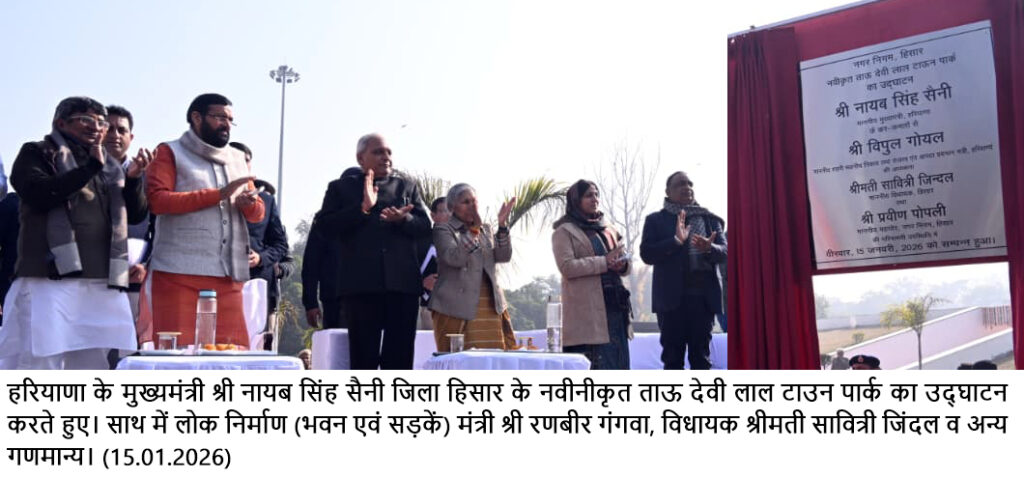चंडीगढ़, 15 जनवरी – हरियाणा के मुख्यमंत्री श्री नायब सिंह सैनी ने वीरवार को हिसार के पीएलए क्षेत्र में बने ताऊ देवी लाल टाउन पार्क के जीर्णोद्धार और नवीनीकरण कार्य का लोकार्पण किया। इस अवसर पर उन्होंने पार्क का भ्रमण कर जनसुविधाओं का जायजा लिया।
