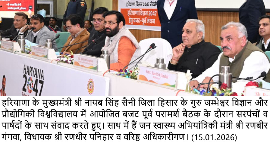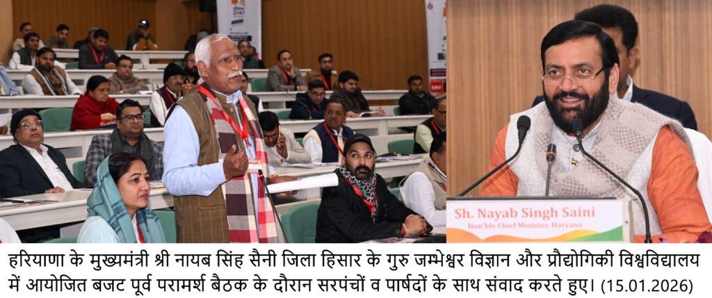 चंडीगढ़, 15 जनवरी। हरियाणा के मुख्यमंत्री श्री नायब सिंह सैनी ने कहा है कि प्रदेश का आगामी बजट केवल सरकारी आंकड़ों तक सीमित नहीं होगा, बल्कि यह हरियाणा के 2.80 करोड़ नागरिकों की आशाओं, आवश्यकताओं और सुझावों पर आधारित होगा। मुख्यमंत्री वीरवार को गुरु जम्भेश्वर विज्ञान एवं प्रौद्योगिकी विश्वविद्यालय, हिसार के सभागार में आयोजित पंचायत एवं नगर निकाय जनप्रतिनिधियों के बजट-पूर्व परामर्श कार्यक्रम को संबोधित कर रहे थे।