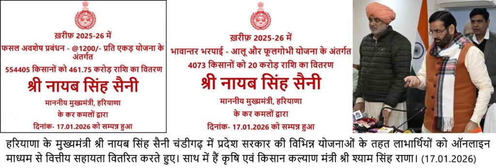चंडीगढ़, 17 जनवरी – हरियाणा के मुख्यमंत्री, श्री नायब सिंह सैनी ने समावेशी और जन-केंद्रित शासन की दिशा में एक महत्वपूर्ण कदम उठाते हुए शनिवार को कई प्रमुख कल्याणकारी योजनाओं के तहत विभिन्न लाभार्थियों को कुल 858 करोड़ रुपये की राशि जारी की, जिसमें पांच कृषि-संबंधी योजनाओं के तहत किसानों के लिए 659 करोड़ रुपये शामिल हैं।
