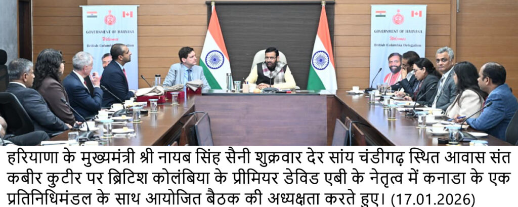 चंडीगढ़, 17 जनवरी – हरियाणा और कनाडा का ब्रिटिश कोलंबिया प्रांत अब साझा विकास के साझेदार बनेंगे। मुख्यमंत्री श्री नायब सिंह सैनी से कनाडा के ब्रिटिश कोलंबिया प्रांत के प्रीमियर श्री डेविड एबी के नेतृत्व में आए उच्चस्तरीय प्रतिनिधिमंडल ने शिष्टाचार भेंट कर विभिन्न क्षेत्रों में सहयोग करने को लेकर चर्चा की। इस मौके पर दोनों प्रांतों के बीच आर्थिक, औद्योगिक और तकनीकी सहयोग को नई दिशा देने के लिए क्लीन एनर्जी, टेक्नोलॉजी, लॉजिस्टिक्स, एग्री-फूड प्रोसेसिंग, स्किल डेवलपमेंट और शिक्षा जैसे प्रमुख क्षेत्रों में साझेदारी को मजबूत करने पर सहमति बनी।