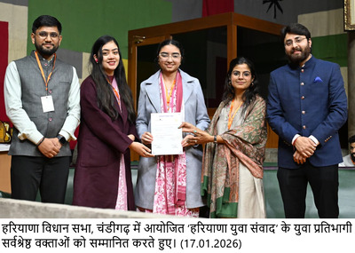 चंडीगढ़, 17 जनवरी – हरियाणा विधान सभा में शनिवार को राजधानी युवा संसद संस्था के सहयोग से आयोजित दो दिवसीय ‘हरियाणा युवा संवाद’ के दूसरे संस्करण का सफलतापूर्वक समापन हुआ। यह कार्यक्रम विधायी प्रक्रियाओं, नीति निर्माण और लोकतांत्रिक मूल्यों से युवाओं को प्रत्यक्ष रूप से जोड़ने की दिशा में एक उल्लेखनीय पहल सिद्ध हुआ। इस अवसर पर राजधानी युवा संसद संस्था की सह संस्थापक एडवोकेट ईशा कपूर और सह-संस्थापक जय सैनी ने कहा कि इस पूरे कार्यक्रम में हरियाणा विधान सभा अध्यक्ष हरविन्द्र कल्याण से प्रतिभागियों को गहन मार्गदर्शन और प्रेरणा मिली, जिसकी बदौलत यह आयोजन अत्यंत सफल रहा। उन्होंने कहा कि अध्यक्ष हरविन्द्र कल्याण विकसित भारत के लिए युवाओं में संवैधानिक जागरुकता लाने के लिए बेहतर प्रयास कर रहे हैं। वे ‘एक राष्ट्र एक विधायिका’ के संकल्प को साकार करने की दिशा में भी महत्वपूर्ण कार्य कर रहे हैं।