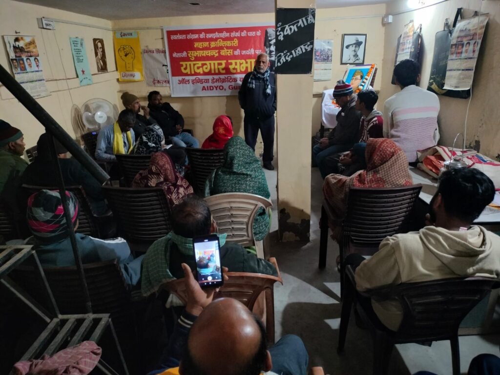 गुड़गांव, 23 जनवरी 2026 – नेताजी सुभाषचंद्र बोस की 129वीं जयंती के अवसर पर ऑल इंडिया डेमोक्रेटिक यूथ ऑर्गेनाइजेशन (AIDYO) जिला कमेटी, गुड़गांव की ओर से सूरत नगर फेस-2 स्थित भगत सिंह सामुदायिक पुस्तकालय में एक विचारोत्तेजक एवं यादगार सभा का आयोजन किया गया। कार्यक्रम में बड़ी संख्या में युवाओं, सामाजिक कार्यकर्ताओं और स्थानीय नागरिकों ने भाग लिया।