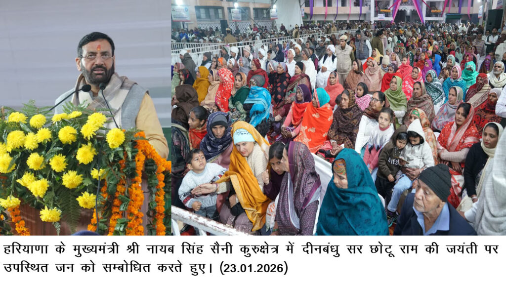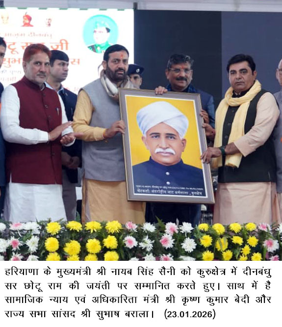 चंडीगढ़, 23 जनवरी- हरियाणा के मुख्यमंत्री श्री नायब सिंह सैनी ने कहा कि दीनबंधु चौधरी छोटूराम के संघर्ष के चलते धरती पुत्र किसान का भाग्य बदला और मजदूर की तकदीर भी बदली। कृषि भूमि की रक्षा, किसान की गरिमा और मेहनतकश की इज्जत ही दीनबंधु चौधरी छोटूराम के जीवन के मूल मंत्र थे। इन्हीं मूल मंत्रों को आधार मानकर डबल इंजन सरकार किसानों का सम्मान और सशक्तिकरण कर रही है।