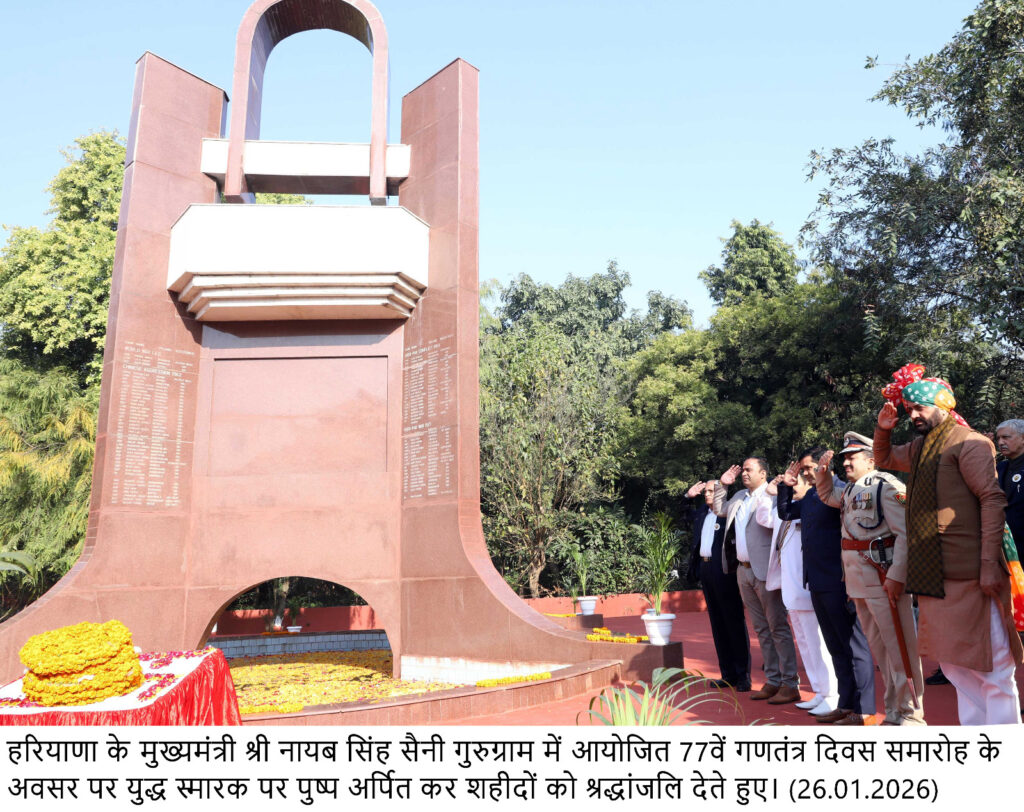 मुख्यमंत्री ने 77वें गणतंत्र दिवस के अवसर पर सोमवार को जिला गुरुग्राम में आयोजित समारोह में राष्ट्रीय ध्वज फहराया। इससे पहले उन्होंने वीर शहीदी स्मारक पर माल्यार्पण कर शहीदों को श्रद्धांजलि अर्पित की। मुख्यमंत्री ने हरियाणा पुलिस, महिला पुलिस, होमगार्ड तथा स्काउट्स सहित विभिन्न टुकड़ियों की परेड का निरीक्षण किया और उन्हें सलामी ली।