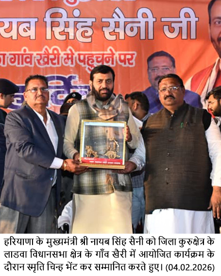 *मुख्यमंत्री नायब सिंह सैनी ने गांव खैरी में विकास कार्यों के लिए 21 लाख रुपए, पानी की पाइपलाइन के लिए 70 लाख रुपए और गांव की फिरनी निर्माण करवाने की करी घोषणा*