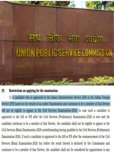 नए नियमों के अनुसार, जो उम्मीदवार पिछली परीक्षाओं के आधार पर भारतीय प्रशासनिक सेवा (IAS) या भारतीय विदेश सेवा (IFS) में नियुक्त हो चुके हैं और वर्तमान में उन सेवाओं के सदस्य हैं, वे सीएसई–2026 में शामिल होने के लिए पूर्णतः अयोग्य होंगे।यह निर्णय वैश्विक प्रशासनिक प्रणालियों के अनुरूप है, जहां शीर्ष सेवाओं को करियर का अंतिम गंतव्य माना जाता है, न कि अस्थायी पड़ाव। इसका उद्देश्य स्पष्ट है—आईएएस और आईएफएस को “स्टेपिंग स्टोन” की तरह प्रयोग करने की मानसिकता का सटीक और निर्णायक अंत।