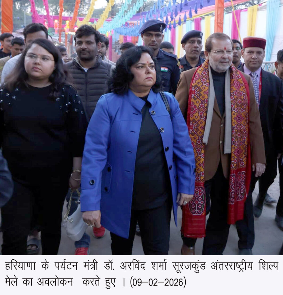 चंडीगढ़, 9 फरवरी – हरियाणा के पर्यटन मंत्री डॉ. अरविंद शर्मा ने सोमवार को अपनी धर्मपत्नी एवं परिवार के अन्य सदस्यों के साथ विश्वविख्यात सूरजकुंड अंतरराष्ट्रीय शिल्प मेले का भ्रमण किया। इस दौरान उन्होंने देश-विदेश से आए शिल्पकारों द्वारा तैयार की गई आकर्षक हस्तशिल्प कलाकृतियों, पारंपरिक उत्पादों तथा सांस्कृतिक विरासत से जुड़ी प्रस्तुतियों का अवलोकन किया और शिल्पकारों से संवाद कर उनके उत्कृष्ट कार्यों की सराहना की।