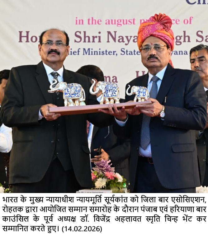 न्यायमूर्ति श्री सूर्यकांत आज रोहतक के न्यायिक परिसर में जिला बार एसोसिएशन द्वारा देश के मुख्य न्यायाधीश के सम्मान में आयोजित सम्मान समारोह समारोह में बतौर मुख्यातिथि न्यायिक अधिकारियों एवं अधिवक्ताओं को संबोधित कर रहे थे।