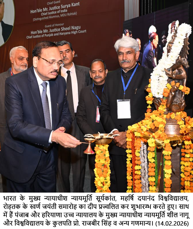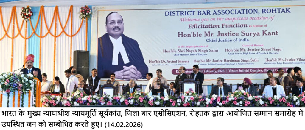 चंडीगढ़ , 14 फरवरी – देश के माननीय मुख्य न्यायाधीश न्यायमूर्ति श्री सूर्यकांत ने कहा कि रोहतक उनका प्रेरणा स्थल रहा है। रोहतक बार एसोसिएशन का देश में कानूनी विचारधारा को सुदृढ़ करने में योगदान रहा है। उन्होंने कहा कि बार व बैंच आमजन के न्याय प्रणाली में विश्वास को बहाल रखें। उन्होंने बताया कि भविष्य की आवश्यकताओं को मद्देनजर रखते हुए सरकार व बार इंटीग्रेटेड कोर्ट कॉम्प्लेक्स स्थापित करने बारे भी विचार करें। देश के सर्वोच्च न्यायालय के नए भवन का तीन चरणों में निर्माण किया जा रहा है, जिसके उपरांत आगामी 50 वर्षों तक यह न्यायालय परिसर पर्याप्त होगा।