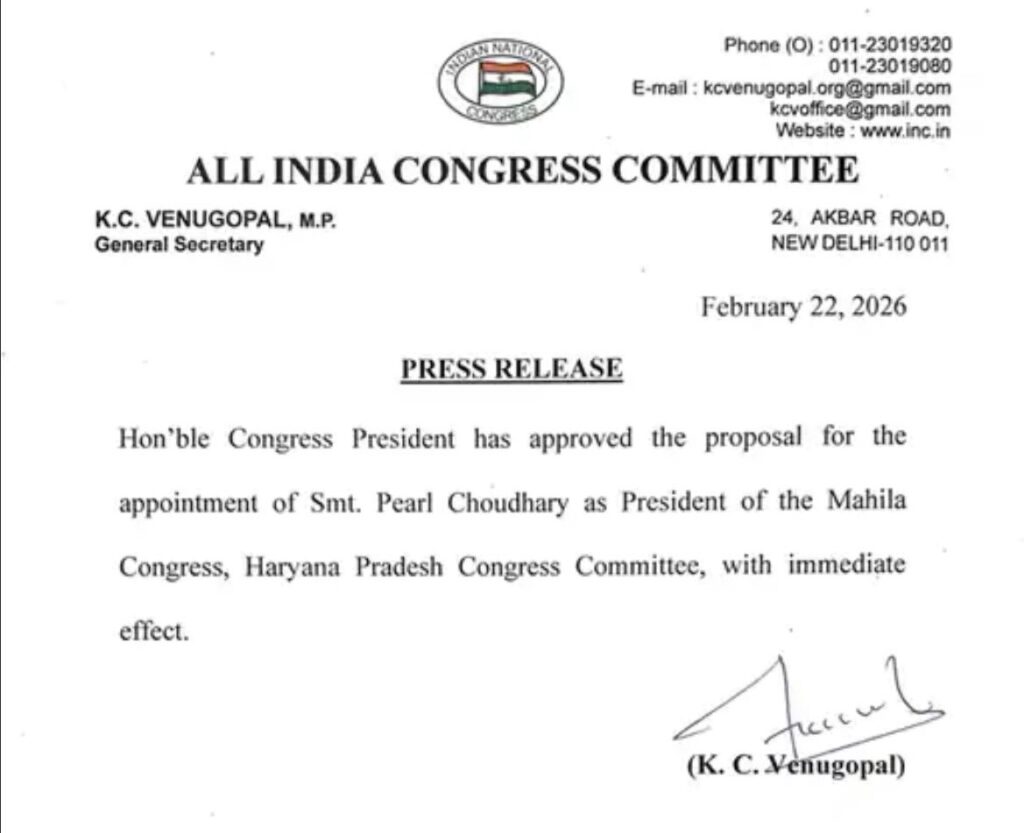 नई दिल्ली/चंडीगढ़, 22 फरवरी 2026।अखिल भारतीय कांग्रेस समिति (एआईसीसी) ने हरियाणा में संगठनात्मक सुदृढ़ीकरण की दिशा में महत्वपूर्ण कदम उठाते हुए श्रीमती पर्ल चौधरी को हरियाणा प्रदेश कांग्रेस कमेटी की महिला कांग्रेस का अध्यक्ष नियुक्त किया है। यह नियुक्ति तत्काल प्रभाव से लागू होगी।