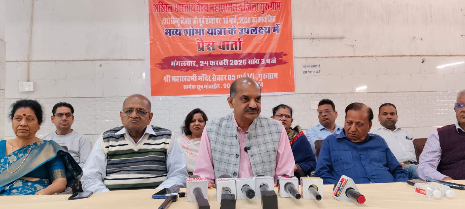 गुरुग्राम। हिंदू नववर्ष एवं वैश्य दिवस की पूर्व संध्या पर बुधवार, 18 मार्च 2026 को गुरुग्राम में भव्य शोभायात्रा निकाली जाएगी। इस शोभायात्रा का आयोजन अखिल भारतीय वैश्य महासम्मेलन द्वारा किया जा रहा है, जिसमें समाज के सभी वर्गों की महिलाओं की सहभागिता सुनिश्चित की जा रही है। यह जानकारी संगठन के राष्ट्रीय महामंत्री एवं पूर्व विधायक उमेश अग्रवाल ने सेक्टर-5 स्थित महालक्ष्मी मंदिर में आयोजित प्रेस वार्ता के दौरान दी।