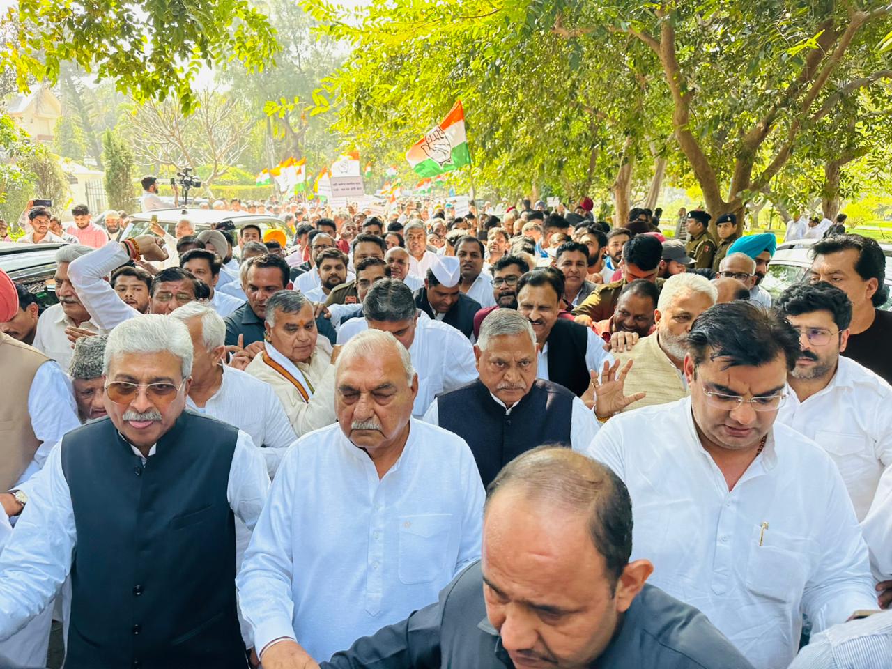 चंडीगढ़, 25 फरवरी। हरियाणा कांग्रेस ने महात्मा गांधी राष्ट्रीय ग्रामीण रोजगार गारंटी अधिनियम (महात्मा गांधी राष्ट्रीय ग्रामीण रोजगार गारंटी अधिनियम) में किए गए बदलावों के विरोध में राजधानी में जोरदार प्रदर्शन किया। कांग्रेस कार्यालय से विधानसभा की ओर निकले इस विशाल मार्च में पार्टी प्रभारी बी. के. हरिप्रसाद, पूर्व मुख्यमंत्री व नेता प्रतिपक्ष भूपेंद्र सिंह हुड्डा, प्रदेश अध्यक्ष राव नरेंद्र सिंह, पूर्व प्रदेश अध्यक्ष चौधरी उदयभान, सांसद दीपेंद्र सिंह हुड्डा सहित अनेक वरिष्ठ नेता, विधायक और हजारों कार्यकर्ता शामिल हुए।