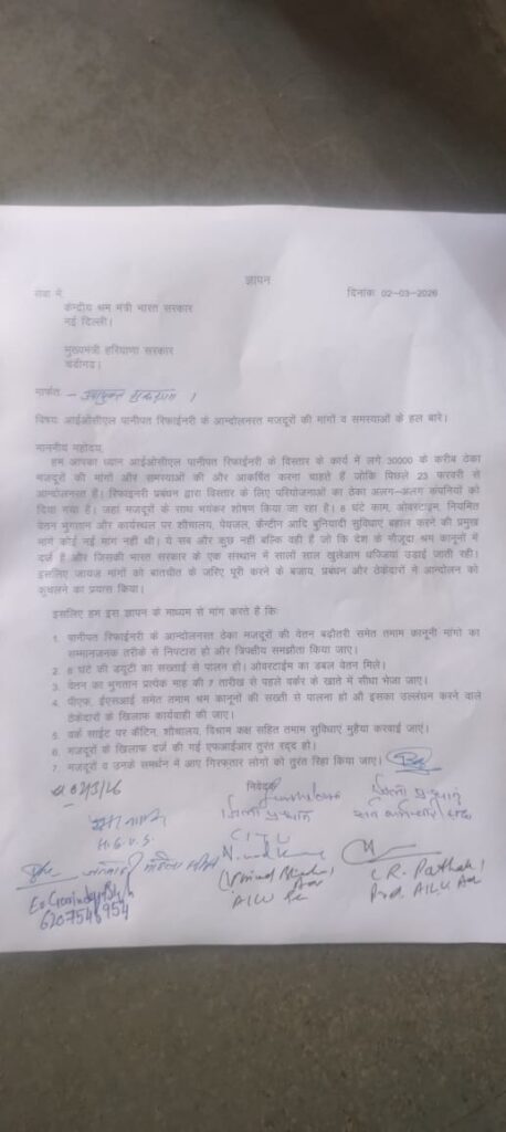 गुरुग्राम, 2 मार्च 2026 – सेंट्रल ऑफ इंडियन ट्रेड यूनियन (सीटू), सर्व कर्मचारी संघ, जनवादी महिला समिति, ज्ञान विज्ञान समिति तथा ऑल इंडिया लॉयर्स यूनियन ने राज्य कमेटी के आह्वान पर सोमवार को पानीपत स्थित तेल शोधक कारखाना/रिफाइनरी में पिछले एक सप्ताह से जारी हड़ताल के समर्थन में तहसीलदार को मांगों का ज्ञापन सौंपा।
