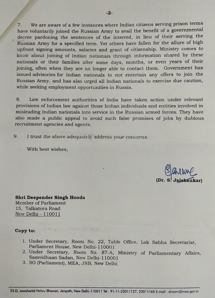 विदेश मंत्री ने पत्र के जरिए कुछ ऐसे मामलों की जानकारी होने की बात भी कही जहाँ जेल में सज़ा काट रहे भारतीय नागरिक अपनी मर्ज़ी से रूसी सेना में शामिल हो गए, ताकि उन्हें एक तय समय तक रूसी सेना में सेवा करने के बदले, जेल में बंद लोगों की सज़ा माफ़ करने के सरकारी आदेश का फ़ायदा मिल सके। कुछ लोग पहले से ज़्यादा साइनिंग अमाउंट, सैलरी और नागरिकता मिलने के लालच में आ गए हैं। भारत सरकार ने भारतीय नागरिकों को रूसी सेना में शामिल होने के किसी भी ऑफ़र पर ध्यान न देने की एडवाइज़री जारी की है और सभी भारतीय नागरिकों से रूस में नौकरी के मौके ढूंढते समय सावधानी बरतने की भी अपील की है।