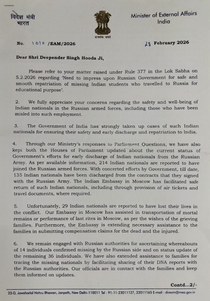 चंडीगढ़, 2 मार्च। सांसद दीपेन्द्र हुड्डा ने विगत 5 फरवरी को लोकसभा में नियम 377 के तहत रूस के युद्ध क्षेत्र में फंसे भारतीय युवाओं, खासकर छात्रों की सुरक्षित वतन वापसी की मांग की थी। इस पर विदेश मंत्री एस. जयशंकर ने पत्र लिखकर सांसद दीपेन्द्र हुड्डा की चिंताओं को सही बताते हुए कहा कि अभी तक उपलब्ध जानकारी के अनुसार, 214 भारतीय नागरिकों के रूसी सेना में शामिल होने की खबर है। विदेश मंत्री एस. जयशंकर ने माना कि नौकरी दिलाने के नाम पर भारतीय नागरिकों को गुमराह किया गया है। सरकार ने 135 भारतीय नागरिकों को रूसी सेना के साथ साइन किए गए कॉन्ट्रैक्ट से छुटकारा दिलाकर इनकी सुरक्षित वतन वापसी में मदद की है। विदेश मंत्री ने यह भी माना कि लड़ाई के दौरान 29 भारतीय नागरिकों की जान जाने की खबर है। मॉस्को में भारतीय दूतावास मृतकों और घायलों के लिए मुआवज़े के दावे जमा करने में परिवारों को ज़रूरी मदद दे रहा है। भारत सरकार का विदेश मंत्रालय रूस में लापता बताए गए 14 लोगों का पता लगाने और बाकी 36 लोगों के स्टेटस अपडेट के लिए रूसी अधिकारियों के साथ लगातार बातचीत कर रहा है। विदेश मंत्रालय रूसी अधिकारियों के साथ मिलकर सभी लापता लोगों की DNA रिपोर्ट शेयर करके उनका पता लगाने में परिवारों की मदद के साथ परिवारों को जरूरी सूचनाएं भी अपडेट करा रहा है।