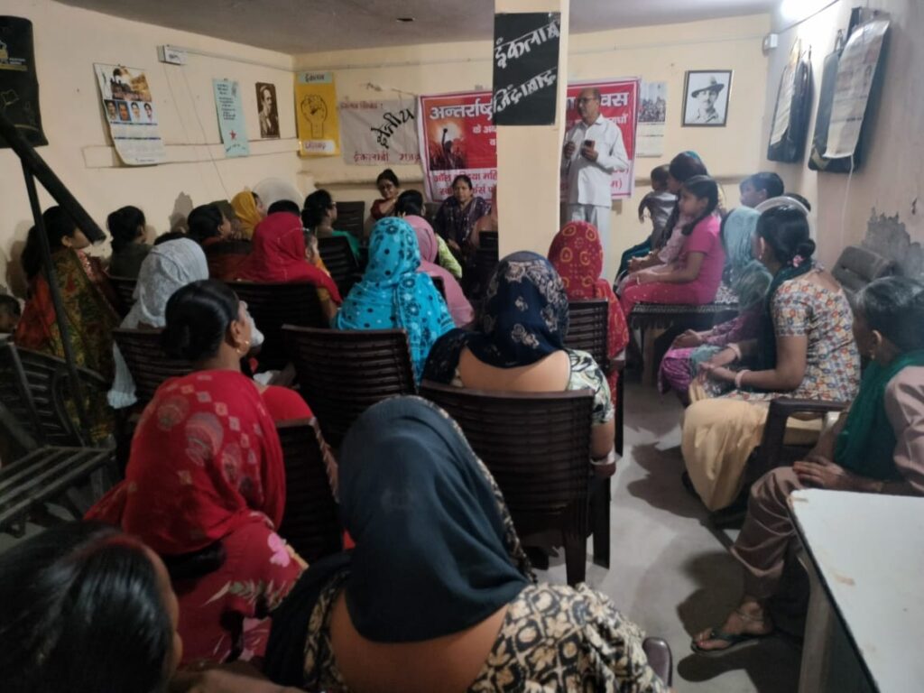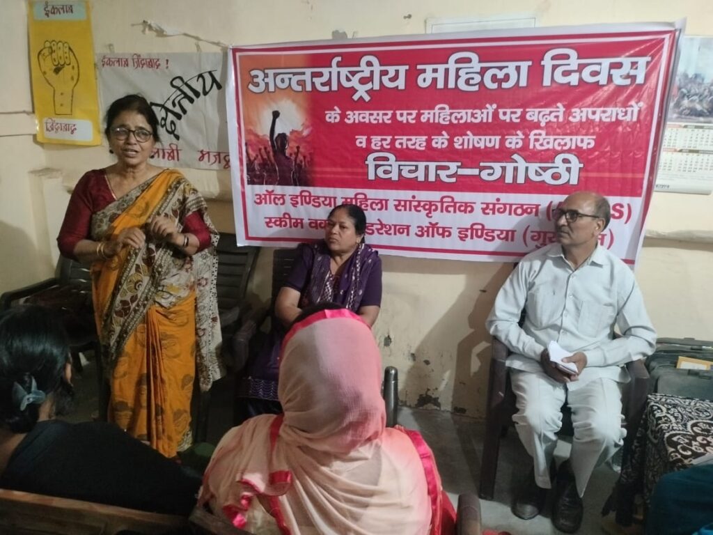 गुरुग्राम, 8 मार्च। अंतर्राष्ट्रीय महिला दिवस के अवसर पर ऑल इंडिया महिला सांस्कृतिक संगठन (AIMSS) गुरुग्राम के तत्वावधान में रविवार को दो स्थानों पर विचार गोष्ठियों का आयोजन किया गया। पहला कार्यक्रम सूरत नगर फेज-2 स्थित शहीद भगत सिंह लाइब्रेरी में तथा दूसरा कार्यक्रम लक्ष्मण विहार फेज-2 स्थित कीर्ति मोंटेसरी स्कूल में आयोजित किया गया। कार्यक्रमों में महिलाओं के अधिकारों, सुरक्षा और समाज में उनकी गरिमा की रक्षा के लिए संगठित संघर्ष की आवश्यकता पर जोर दिया गया।