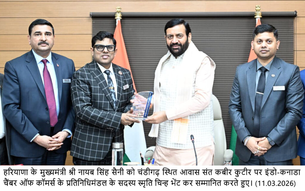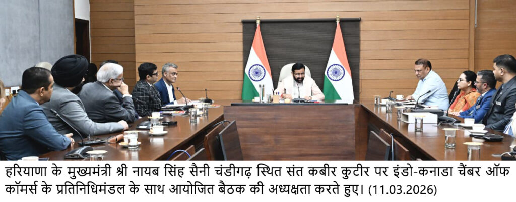 चंडीगढ़, 11 मार्च – हरियाणा के मुख्यमंत्री श्री नायब सिंह सैनी ने बुधवार को अपने आवास संत कबीर कुटीर पर इंडो-कनाडा चैंबर ऑफ कॉमर्स के अध्यक्ष श्री प्रशांत श्रीवास्तव के नेतृत्व में आए एक प्रतिनिधिमंडल के साथ उच्चस्तरीय बैठक की। प्रतिनिधिमंडल के सदस्यों का स्वागत करते हुए मुख्यमंत्री ने कहा कि हरियाणा कनाडा के साथ बढ़ते सहयोग को एक महत्वपूर्ण अवसर के रूप में देखता है। उन्होंने कहा कि आज की वैश्विक अर्थव्यवस्था में वे देश और क्षेत्र तेजी से प्रगति कर रहे हैं, जो ज्ञान, नवाचार और प्रौद्योगिकी पर आधारित साझेदारियां स्थापित कर रहे हैं।