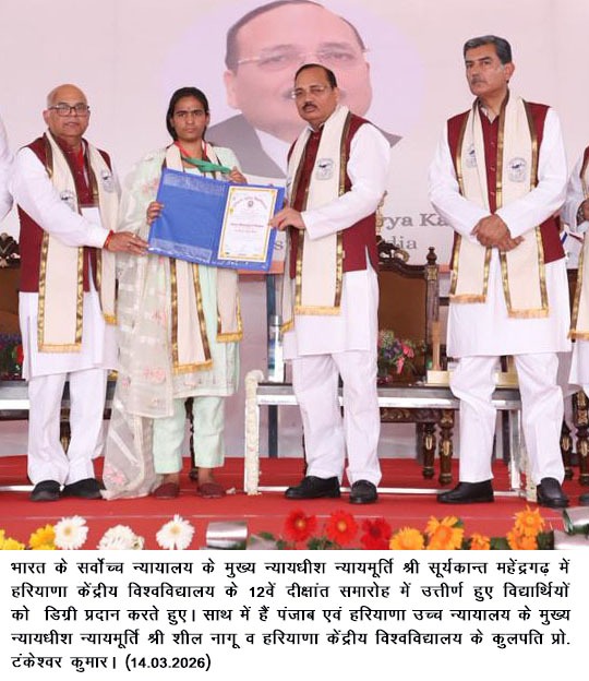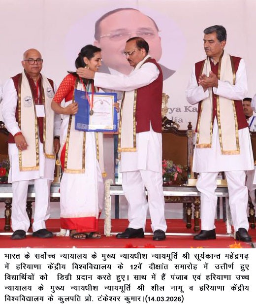चंडीगढ़, 14 मार्च- हरियाणा केंद्रीय विश्वविद्यालय (हकेवि) महेंद्रगढ़ के प्रांगण में शनिवार को भव्य 12वें दीक्षांत समारोह का आयोजन किया गया। इस मौके पर सर्वोच्च न्यायालय के मुख्य न्यायाधीश न्यायमूर्ति सूर्य कांत मुख्य अतिथि के रूप में उपस्थित हुए। वहीं पंजाब एवं हरियाणा उच्च न्यायालय के मुख्य न्यायाधीश न्यायमूर्ति शील नागू व आईआईटी रोपड़ के निदेशक डॉ. राजीव आहूजा समारोह के विशिष्ट अतिथि के रूप में उपस्थित हुए।