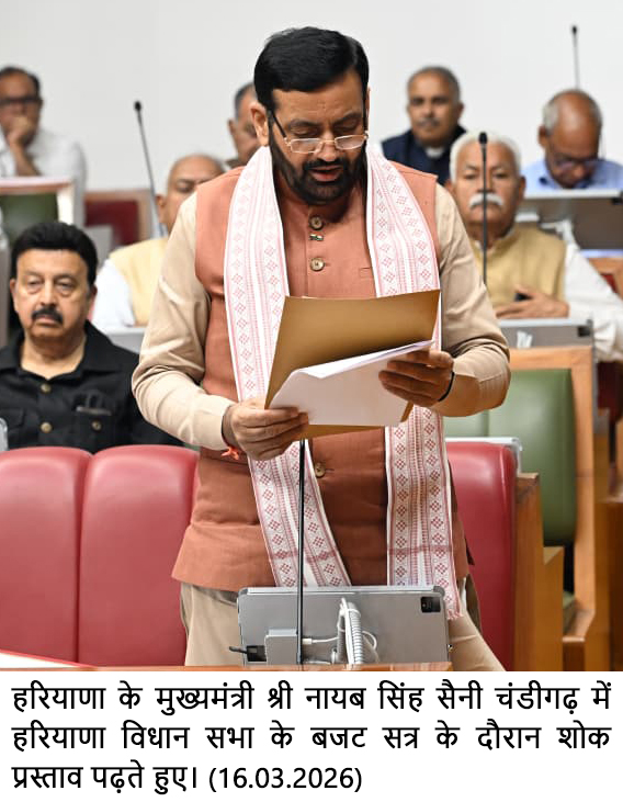 चंडीगढ़, 16 मार्च – हरियाणा के मुख्यमंत्री श्री नायब सिंह सैनी ने सोमवार को हरियाणा विधानसभा में चल रहे बजट सत्र के दौरान सदन में शोक प्रस्ताव पढ़ते हुए हरियाणा विधानसभा के अध्यक्ष श्री हरविंद्र कल्याण की माता श्रीमती प्रेम कौर कल्याण के निधन तथा गुरुग्राम में एक कंस्ट्रक्शन साइट पर हुए हादसे में 7 लोगों की मृत्यु पर गहरा शोक व्यक्त किया। उन्होंने शोक-संतप्त परिवारों के प्रति अपनी संवेदना प्रकट की।