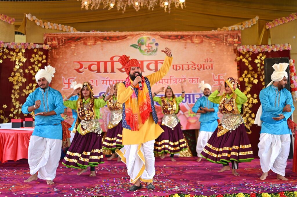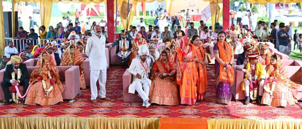 समारोह के दौरान कलाकारों ने सांस्कृतिक प्रस्तुतियां देकर माहौल को उत्सवमय बना दिया। मंच पर एक साथ सभी जोड़ों की संगीत की धुनों और पुष्पवर्षा के बीच जयमाला कराई गई, जबकि इससे पहले रिंग सेरेमनी भी आयोजित की गई।