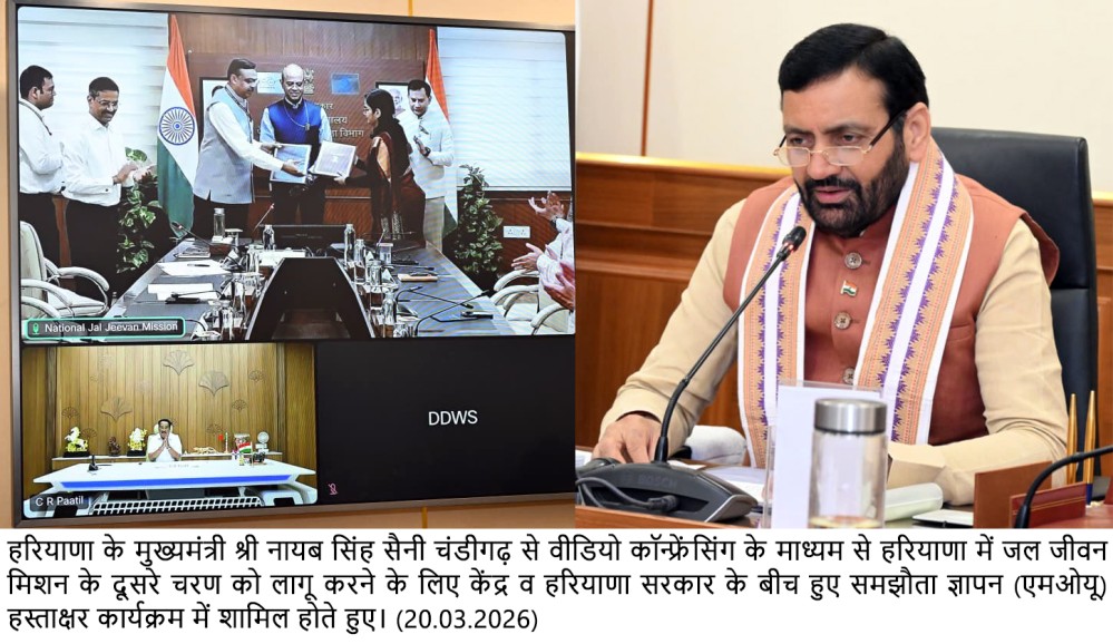 चंडीगढ़, 20 मार्च — हरियाणा में जल जीवन मिशन के दूसरे चरण को लागू करने के लिए शुक्रवार को वर्चुअल माध्यम से केंद्रीय जल शक्ति मंत्री श्री सी.आर. पाटिल और मुख्यमंत्री श्री नायब सिंह सैनी की मौजूदगी में केंद्र सरकार व हरियाणा सरकार के बीच समझौता ज्ञापन (एमओयू) पर हस्ताक्षर किए गए। हरियाणा सरकार की ओर से जन स्वास्थ्य अभियांत्रिकी विभाग के आयुक्त एवं सचिव श्री मोहम्मद शाइन ने एमओयू पर हस्ताक्षर किए।