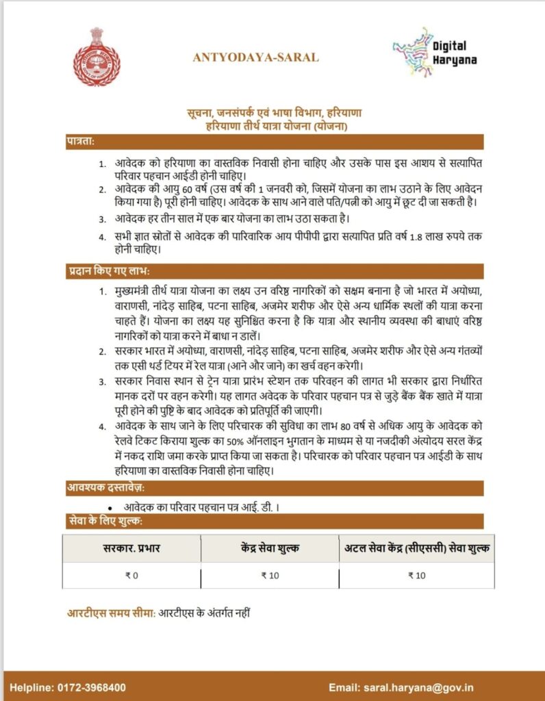 जिला सूचना एवं जनसंपर्क अधिकारी बिजेंद्र कुमार ने बताया कि मुख्यमंत्री तीर्थ यात्रा योजना के अंतर्गत यात्रा करने के इच्छुक वृद्ध जन 22 मार्च तक www.saralharyana.nic.in पोर्टल पर पंजीकरण कर सकते हैं। इस योजना के लिए पात्र लाभार्थी की आयु 60 वर्ष से अधिक होनी चाहिए। वह हरियाणा का स्थाई निवासी होना चाहिए। इसके अलावा उसकी वार्षिक आय एक लाख 80 हजार से कम होनी चाहिए।