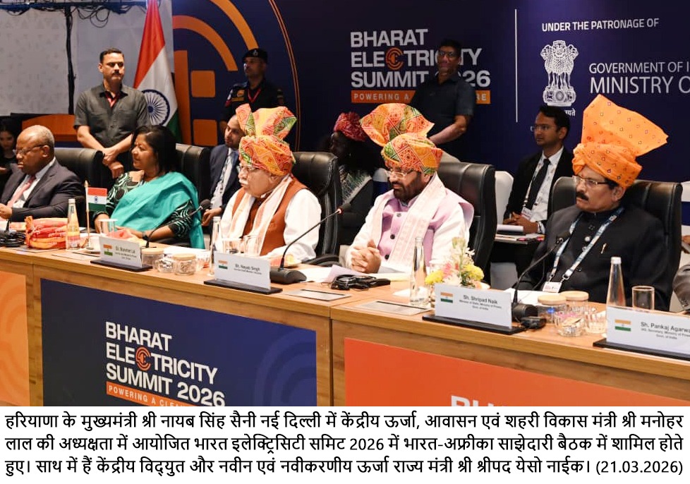 मुख्यमंत्री श्री नायब सिंह सैनी शुक्रवार को भारत इलेक्ट्रिसिटी समिट— 2026 के अंतर्गत नई दिल्ली में आयोजित भारत–अफ्रीका सामरिक साझेदारी बैठक को संबोधित कर रहे थे। कार्यक्रम की अध्यक्षता केंद्रीय उर्जा एवं आवासन मंत्री श्री मनोहर लाल ने की, जबकि केंद्रीय ऊर्जा एवं नवीन एवं नवीकरणीय ऊर्जा राज्य मंत्री श्री श्रीपद येस्सो नाइक ने भी समिट को संबोधित किया।