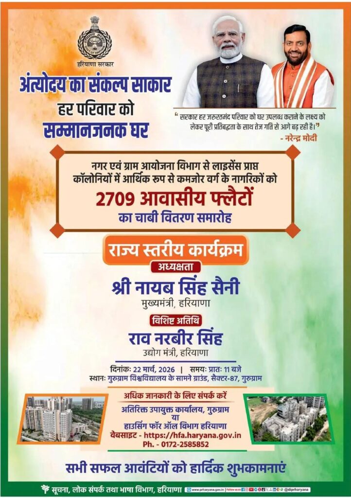 गुरुग्राम, 21 मार्च। हरियाणा के मुख्यमंत्री श्री नायब सिंह सैनी आज सेक्टर-91, काकरौला में आयोजित “विकसित बादशाहपुर महारैली” एवं मुख्यमंत्री शहरी आवास योजना के लाभार्थियों के आवास आबंटन समारोह में मुख्य अतिथि के रूप में शामिल होंगे। कार्यक्रम की अध्यक्षता उद्योग एवं वाणिज्य मंत्री राव नरबीर सिंह करेंगे। इस अवसर पर मुख्यमंत्री प्रदेश सरकार की जनकल्याणकारी नीतियों एवं विकास कार्यों को लेकर जनसमूह को संबोधित करेंगे। साथ ही, मुख्यमंत्री शहरी आवास योजना के तहत 2709 पात्र लाभार्थियों को आवास की चाबियां सौंपकर उन्हें उनके आशियाने का अधिकार प्रदान करेंगे।