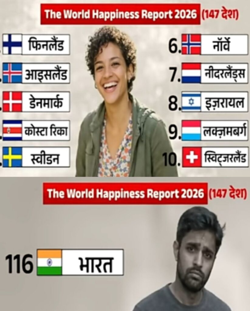इंडिया इस रिपोर्ट में 147 देशों में 116वें स्थान पर है, जिसका स्कोर लगभग 4.536 है। हालांकि यह पिछले वर्ष की तुलना में हल्का सुधार है, फिर भी यह स्थिति चिंताजनक है।विशेष रूप से भारत का स्थान नेपाल (99) और पाकिस्तान (104) से भी पीछे है।यह प्रश्न स्वाभाविक हैजब भारत दुनिया की चौथी सबसे बड़ी अर्थव्यवस्था है, तो खुशहाली में इतना पीछे क्यों?इसका उत्तर निम्न कारकों में छिपा है: