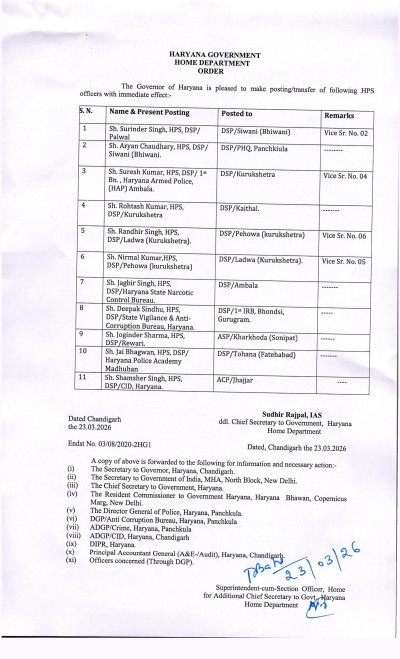 जारी आदेश के अनुसार, सुरिंदर सिंह (HPS) को DSP/सिवानी (भिवानी) नियुक्त किया गया है, जबकि अव्यान चौधरी को DSP/PHQ, पंचकूला भेजा गया है। इसी प्रकार सुरेश कुमार (HPS) को DSP/कुरुक्षेत्र तथा रोहताश कुमार को DSP/कैथल लगाया गया है।