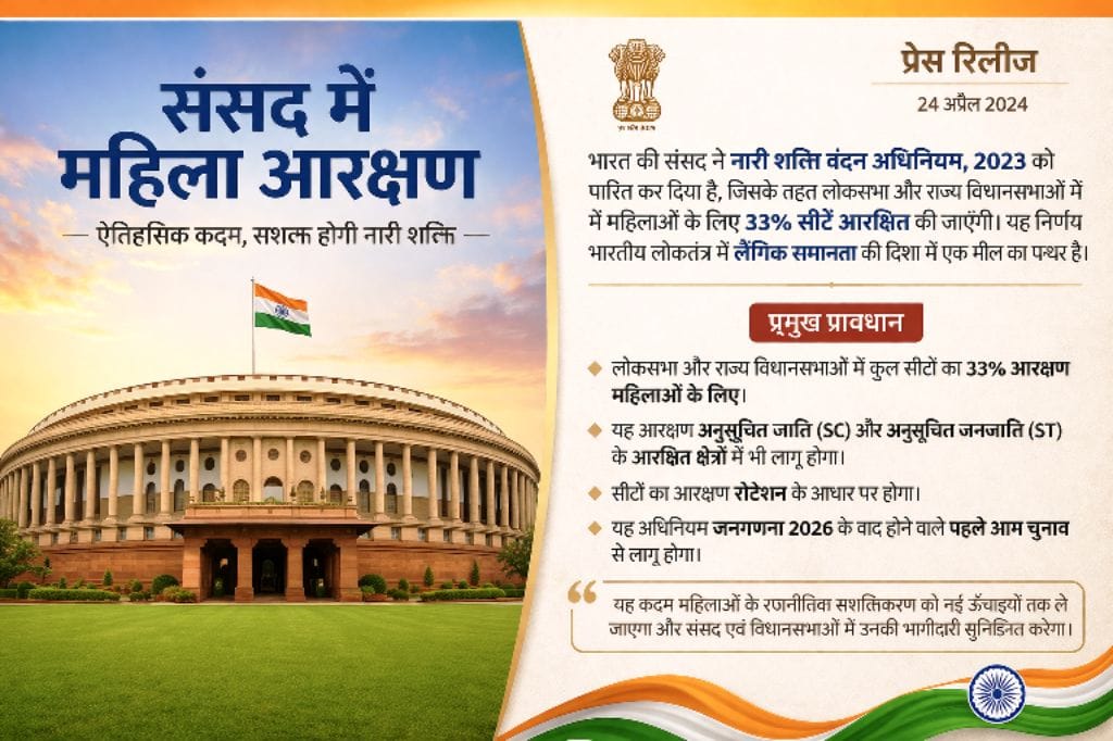 - लोकसभा और राज्य विधानसभाओं में 33% सीटें महिलाओं के लिए आरक्षित