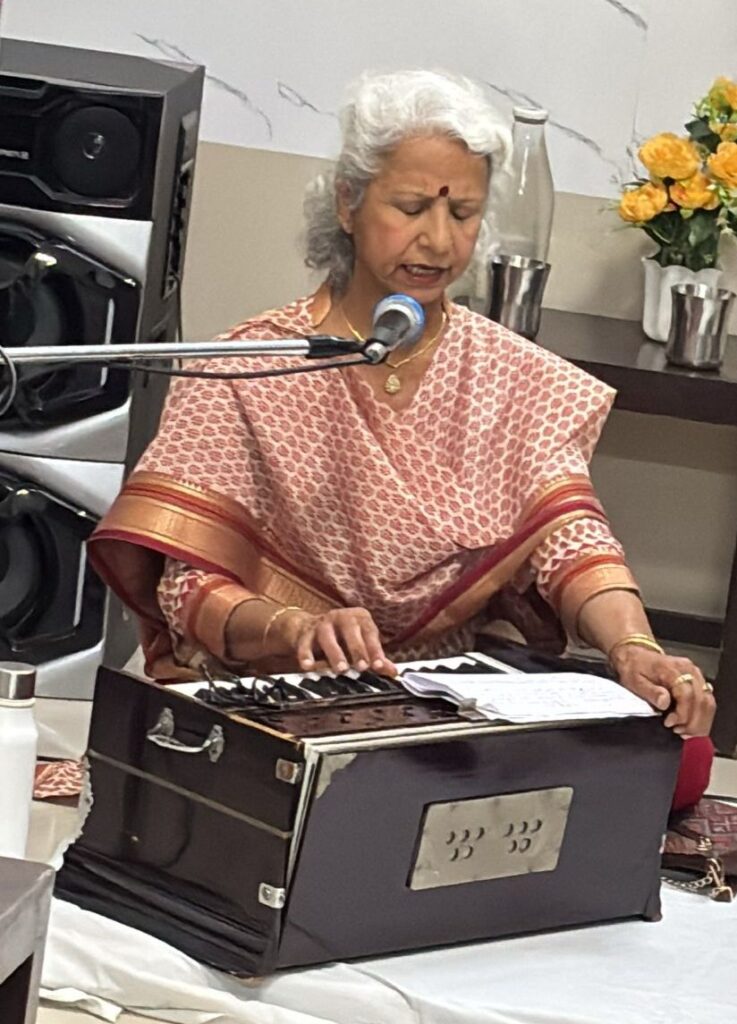 इसके उपरांत श्रीमती सुषमा गांधी ने अपनी मधुर, सुरमयी और भावपूर्ण प्रस्तुति से ऐसा समाँ बाँधा कि पूरा सभागार भक्ति रस में सराबोर हो गया। उन्होंने “ऐसा वरदान दे दो माँ…” से कार्यक्रम का शुभारंभ किया। इसके बाद “जग में सुंदर हैं दो नाम…”, “मत कर तू अभिमान रे बंदे…”, “प्रभु हम पे कृपा करना…”, “अब सौंप दिया इस जीवन का…” और “भजन बिना चैन ना आए राम…” जैसे भजनों की श्रृंखला प्रस्तुत कर श्रोताओं को भाव-विभोर कर दिया।