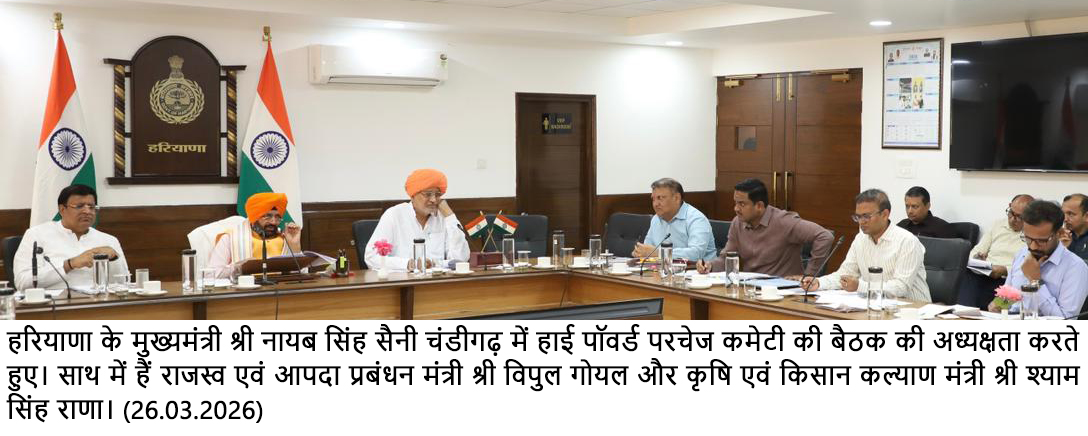 चंडीगढ़, 26 मार्च- हरियाणा के मुख्यमंत्री श्री नायब सिंह सैनी की अध्यक्षता में आज यहां हुई हाई पावर्ड परचेज कमेटी की बैठक में रबी 2026-2027 सीजन के लिए भंडारण व्यवस्थाओं को सुदृढ़ बनाने के उद्देश्य से महत्वपूर्ण निर्णय लिए गए। बैठक में 550 करोड़ रुपये से जूट व अन्य बैगों की खरीद के दो एजेंडे थे, नेगोसिएशन करके 80 करोड़ रुपये बचाए गए। गेहूं के सुरक्षित भंडारण को सुनिश्चित करने के लिए जूट बैगों तथा अन्य बैगों की खरीद को मंजूरी प्रदान की गई।