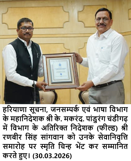 चंडीगढ़, 30 मार्च — हरियाणा सूचना, जनसम्पर्क एवं भाषा विभाग मुख्यालय के अतिरिक्त निदेशक (फील्ड) श्री रणबीर सिंह सांगवान 28 वर्ष 4 माह की संतोषजनक एवं समर्पित सेवा पूर्ण करने के उपरांत आज सेवानिवृत्त हो गए। इस अवसर पर विभाग द्वारा उनके सम्मान में एक गरिमामयी विदाई समारोह का आयोजन किया गया।