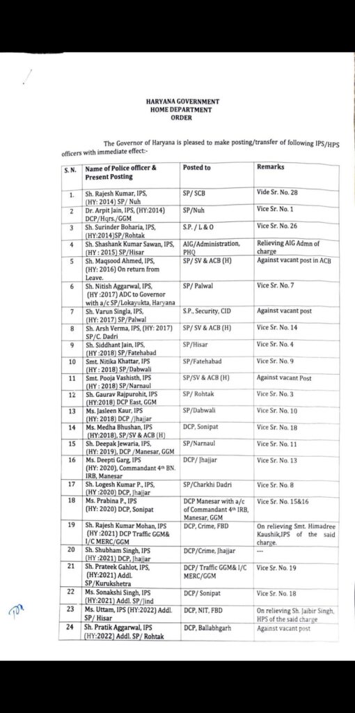 इसके अलावा एचपीएस अधिकारियों में भी कई अहम तबादले हुए हैं। सिद्धार्थ धांडा को पंचकूला में टेलीकॉम और ईआरएसएस का कार्यभार सौंपा गया है, जबकि संदीप कुमार को गुरुग्राम ईस्ट में डीसीपी नियुक्त किया गया है।