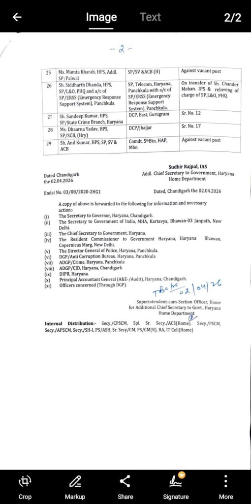 चंडीगढ़, 2 अप्रैल 2026। हरियाणा सरकार के गृह विभाग ने प्रदेश में प्रशासनिक फेरबदल करते हुए आईपीएस और एचपीएस अधिकारियों के बड़े स्तर पर तबादले और नई नियुक्तियों के आदेश जारी किए हैं। राज्यपाल की मंजूरी के बाद जारी इस आदेश के तहत कुल 29 अधिकारियों को तत्काल प्रभाव से नई जिम्मेदारियां सौंपी गई हैं।