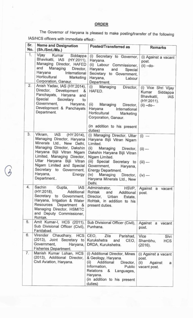 जारी आदेश के मुताबिक वरिष्ठ IAS अधिकारी विजय कुमार सिद्धप्पा भवीकट्टी को राज्यपाल के सचिव के साथ-साथ श्रम आयुक्त एवं श्रम विभाग के विशेष सचिव की जिम्मेदारी दी गई है। वहीं अनिश यादव को हैफेड (HAFED) का प्रबंध निदेशक और हरियाणा इंटरनेशनल हॉर्टिकल्चर मार्केटिंग कॉर्पोरेशन, गनौर का अतिरिक्त प्रभार सौंपा गया है।